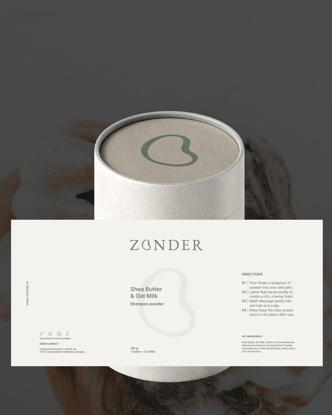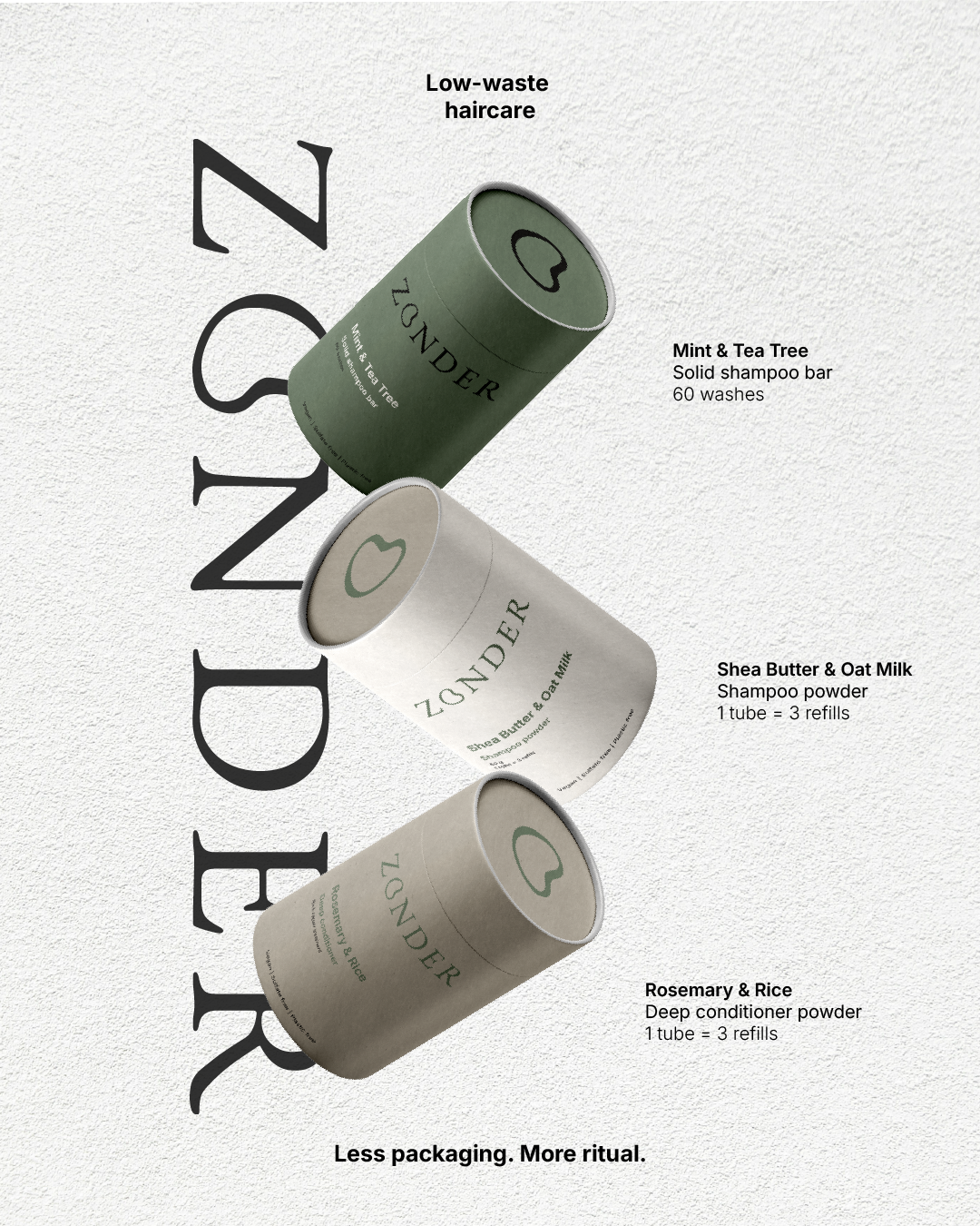 Inspired by slow living and modern editorial design, ZONDER positions low waste haircare as an everyday choice, not a compromise.